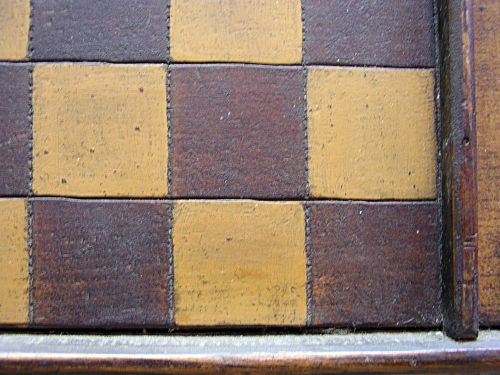 Gameboard with Mustard painted surface dating to around 1910 looking at the construction with screws holding ends to board. Great untouched surface with appropriate wear.